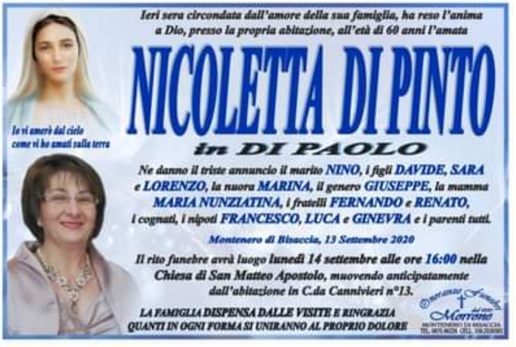 E' salita in cielo l'anima della cara Cesira Morrone. I funerali avranno luogo mercoledi 23 settembre alle ore 18, nella chiesa di San Matteo Apostolo.