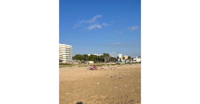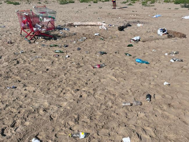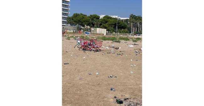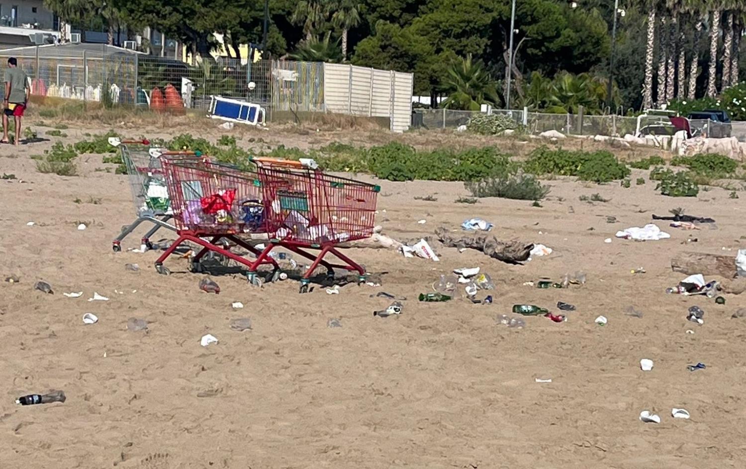 Bottiglie e bicchieri disseminati un po' ovunque, persino tre carrelli con ogni evidenza sottratti a qualche supermercato, buste e dulcis in fundo bottiglie di vetro. Qualcuna rotta con i frammenti che la sabbia comincia a nascondere: si spera che nessuno ci passi sopra.