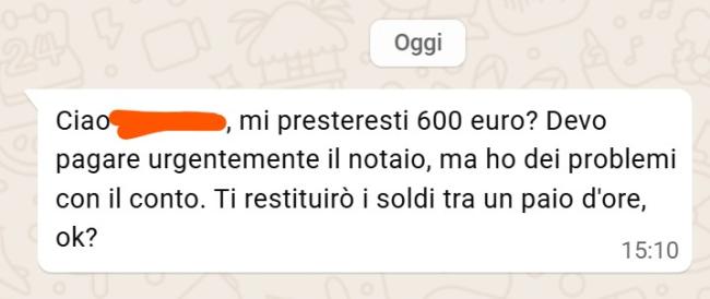 MONTENERO DI BISACCIA. Anche in paese si stanno registrando tentativi di truffa con i falsi messaggi via Whatsapp. "Ciao (nome) mi presteresti 600 euro? Devo pagare urgentemente il notaio, ma ho dei problemi con il conto. Ti restituirò i soldi tra un paio d'ore, ok?". Questo il testo che arriva da un numero che si ha in rubrica, di persona conosciuta. Se non si sospetta subito, si rischia di credere che davvero si tratti della persona conosciuta e di cui si ha il numero. Perché in realtà si tratta di un cosiddetto hackeraggio: qualcuno si è impossessato del suo profilo Whatsapp e sta inviando messaggi, a suo nome e all'apparenza normali, ai suoi contatti.