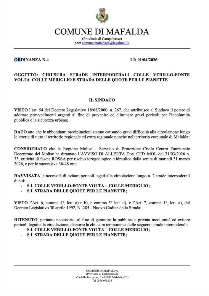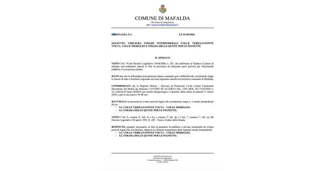 Messaggi diffusi dall'amministrazione comunale di Mafalda: