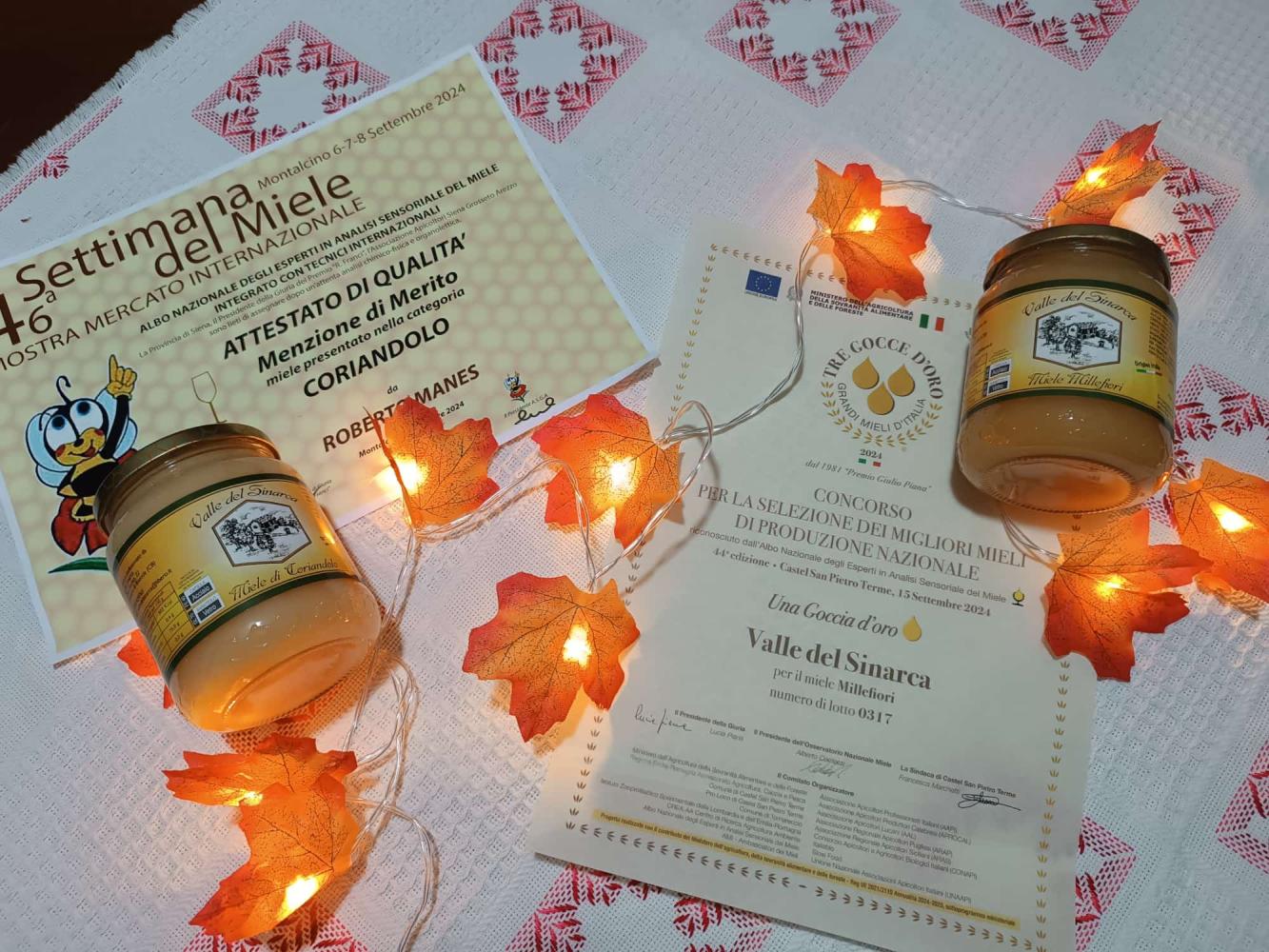 MONTENERO DI BISACCIA. Nuovi prestigiosi riconoscimenti per Il miele “Valle del Sinarca”. Dopo i numerosi attestati conferiti nei passati anni il miele di Roberto Manes anche nel 2024 si conferma tra le migliori eccellenze d’Italia. A Montalcino (Siena), lo scorso 6-7-8 settembre, in occasione della 46esima edizione della “Settimana del Miele” è stato conferito l’attestato di qualità, menzione di merito per il miele di coriandolo. Il bis è arrivato in occasione della 44esima edizione del Concorso per la selezione dei migliori mieli di produzione nazionale “Tre Gocce d’Oro - Grandi Mieli d’Italia - Premio Giulio Piana” che si è tenuto lo scorso 15 settembre a Castel San Pietro Terme: l’osservatorio Nazionale Miele ha attribuito la goccia d’oro al miele di millefiori. Nonostante l’alto numero di partecipanti a queste due manifestazioni nazionali il miele “Valle del Sinarca” con la sua qualità e la sua unicità ha conquistato le attenzioni delle attente giurie. Per Roberto Manes la valorizzazione del territorio ed il rispetto delle tradizioni rappresentano i cardini della passione per l’apicoltura tramandata da generazioni. Il miele “Valle del Sinarca” nasce dalla fioritura di coltivazioni locali, in successione acacia, sulla, coriandolo, millefiori e girasole. Queste autorevoli menzioni arrivano dopo un’annata difficile, ma il lavoro e l’amore della famiglia Manes per l’apicultura ha portato per l’ennesima volta il Molise a raccogliere dolci encomi.