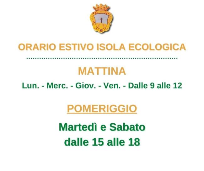 Si informa la cittadinanza che a partire da sabato 21 giugno 2025 entrerà in vigore l’orario estivo di apertura dell’Isola Ecologica in Contrada Cannivieri.
