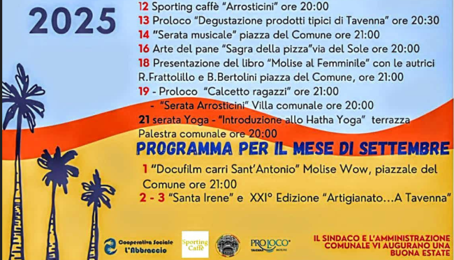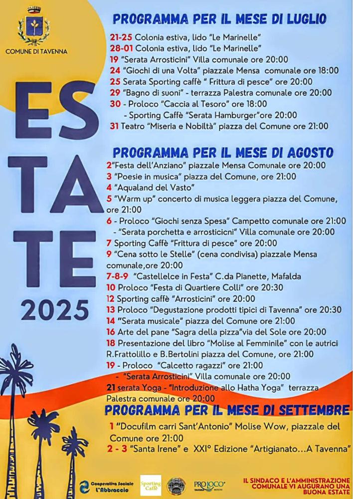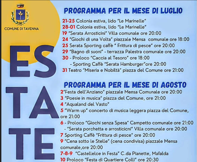 Pubblichiamo di seguito il "Calendario dell' Estate Tavennese 2025" che troverete affisso, anche sulle vetrine delle attività commerciali del nostro paese e sulle bacheche.