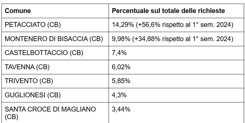 | PETACCIATO (CB) | 14,29% (+56,6% rispetto al 1° sem. 2024) |
