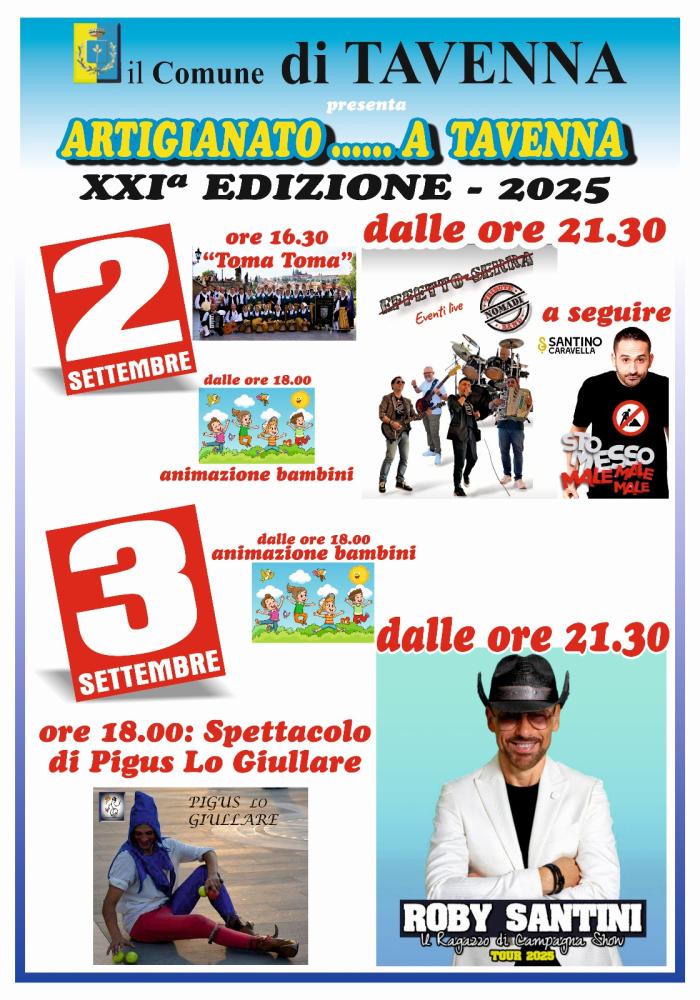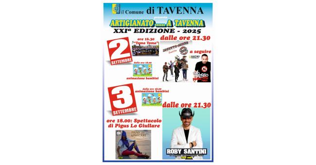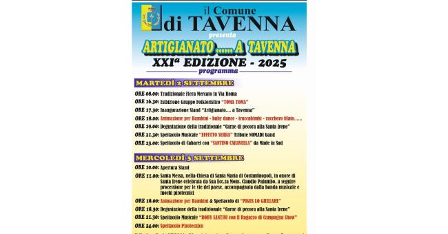 Alle ore 17:30, il sindaco Paolo Cirulli e l'amministrazione comunale, alla presenza di esponenti del governo regionale, di autorità e di sindaci dei comuni vicini, inaugurerà con il taglio del nastro, la XXI edizione di "Artigianato a… Tavenna."