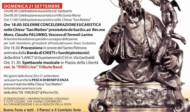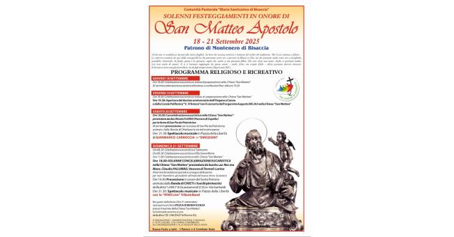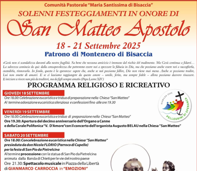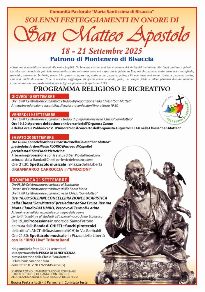 Apostolo in questo anno Santo 2025; il Comitato desidera sin da ora ringraziare tutti coloro che hanno contribuito e stanno contribuendo all’organizzazione e alla realizzazione dell’evento: sponsor ed esercenti, l’Amministrazione Comunale e tutta la cittadinanza di Montenero di Bisaccia che ogni anno si dimostra sempre più generosa e partecipativa.