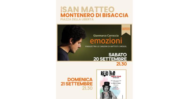 Sarà GIANMARCO CARROCCIA con il suo spettacolo “Emozioni - Viaggio tra le canzoni di Battisti e Mogol” ad esibirsi dal vivo in un concerto ed uno spettacolo musicale imperdibile a Montenero di Bisaccia con ingresso gratuito in Piazza della Libertà il prossimo sabato 20 settembre alle ore 21,30.