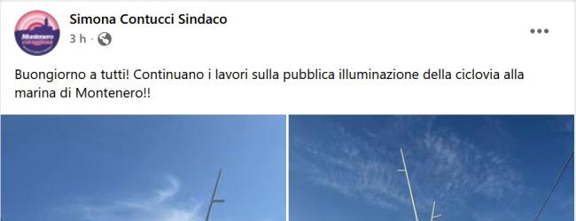 Ore 11:43: sulla pagina Facebook Simona Contucci sindaco esce un post, dove le foto pubblicate sono tre e la didascalia la seguente: "Buongiorno a tutti! Continuano i lavori sulla pubblica illuminazione della ciclovia alla Marina di Montenero!!". Le foto riprendono un tratto di pista ciclabile più distante da quello invaso dalle erbacce, dove i lavori sono ancora in corso e riguardano l'installazione dell'illuminazione.