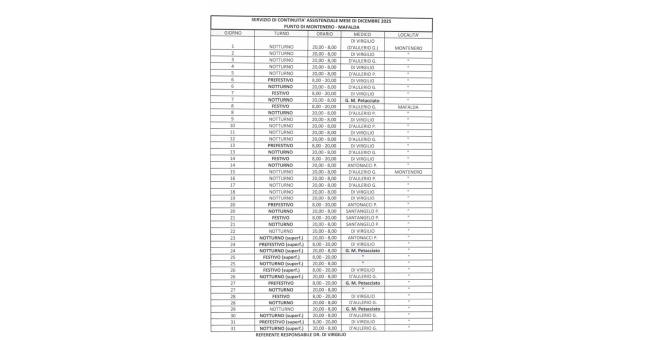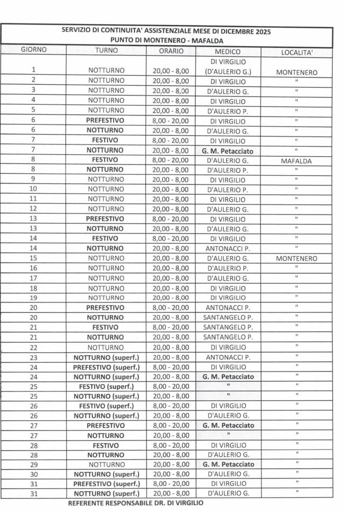MONTENERO DI BISACCIA - MAFALDA. Turnazione delle postazioni di guardia medica nel mese di dicembre 2025.