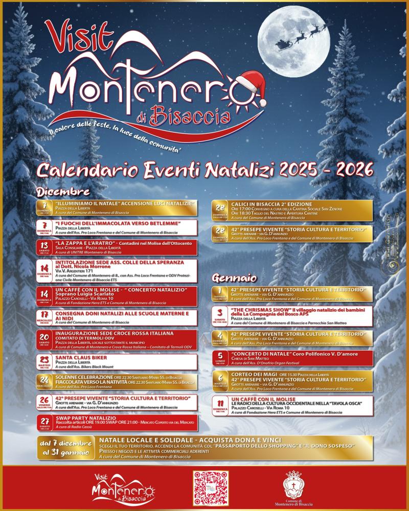 Il Comune di Montenero di Bisaccia, grazie alla collaborazione di associazioni, fondazioni, volontari e tante altre realtà locali, contribuiranno a rendere vivo un calendario ricco di calore e partecipato.