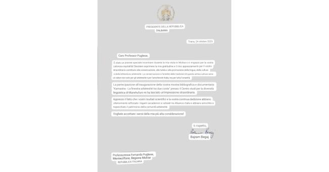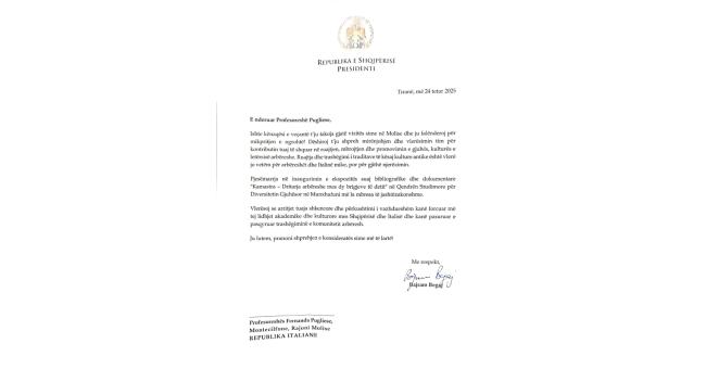 Lettera di ringraziamento del presidente della Repubblica d'Albania Bajram