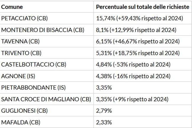 | PETACCIATO (CB) | 15,74% (+59,43% rispetto al 2024) |