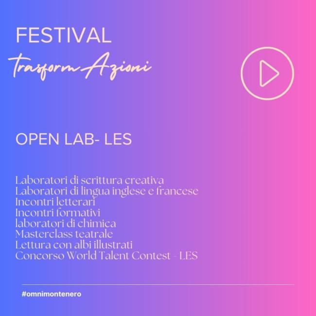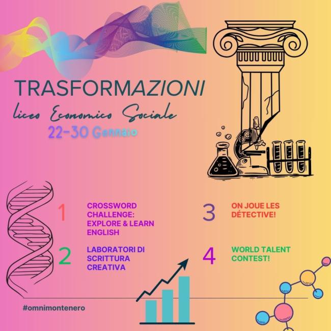 "TrasformAzioni" anche al Liceo delle scienze umane, indirizzo Economico- Giuridico, in particolare quelle legate alle lingue, alla produzione scritta e orale. Laboratori di scrittura creativa e per il web e di mostre virtuali, inoltre, con la realizzazione di prodotti di approfondimento immersivi e di valorizzazione della storia e della cultura del nostro patrimonio artistico e comunitario. La settimana di laboratori chiuderà venerdì 30, nel corso della quale saranno annunciati i finalisti del concorso World Talent Contest a cura del Les in attesa della premiazione dei vincitori, prevista in occasione degli Open day, che ci saranno il 28 gennaio e 5 febbraio.