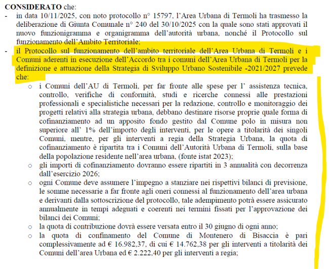 E difatti nelle varie voci è citata la Strategia urbana, come anche il "Protocollo sul funzionamento dell’ambito territoriale dell’Area urbana di Termoli". E non pare trattarsi di un documento qualunque, poiché regola le risorse extra che ogni Comune destina a un progetto. Ma è anche il documento redatto dalla struttura tecnica municipale di Termoli il 30 ottobre 2025 e approvato tal quale dalla giunta adriatica per prima, a seguire da quelle di Montenero, Mafalda e Portocannone. Senza evidentemente fare caso o dare peso a due errori: tutti i sindaci erano indicati come laureati (dott. e avv. in due casi) e il sindaco di Mafalda attribuito a Tavenna, che nemmeno fa parte del progetto di cooperazione. Come spiegato, dei dieci sindaci solo quattro lo sono davvero. Ne consegue che quando il documento è passato per le giunte di Montenero, Mafalda e Portocannone anche ai diretti interessati sono sfuggiti gli errori all'alloro. Oltre che la svista sulla fascia tricolore spostata da Mafalda a Tavenna.