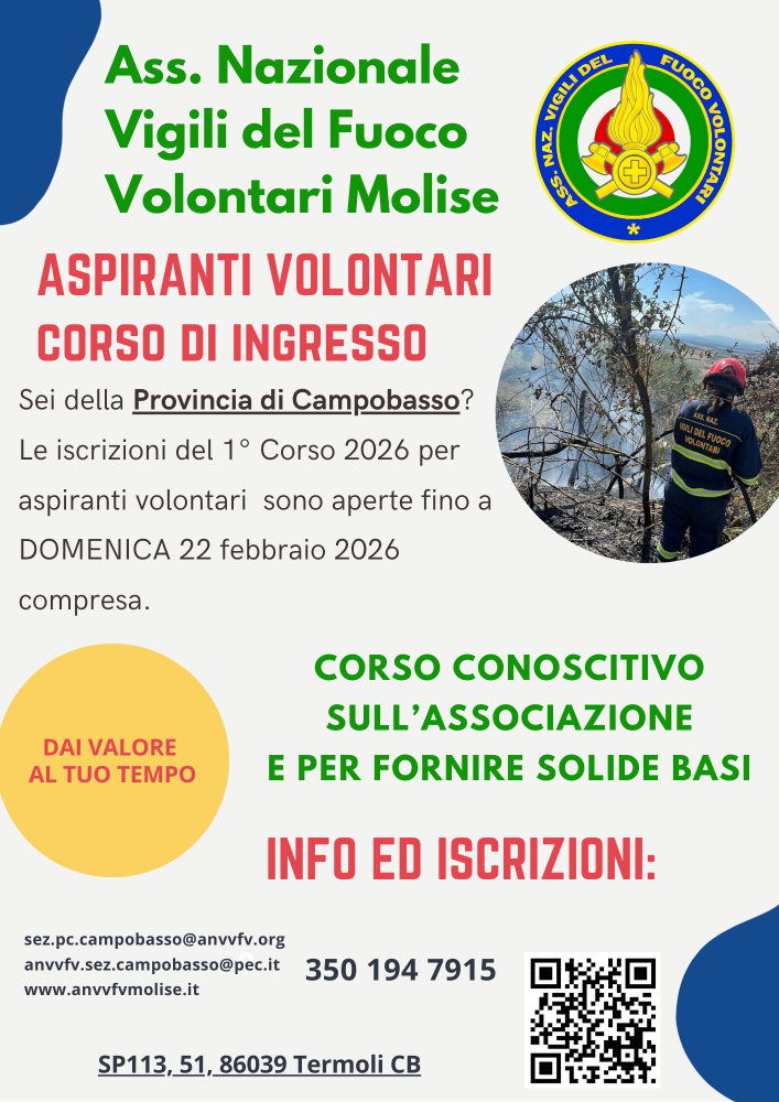 L'Associazione Nazionale Vigili del Fuoco Volontari (Molise)-Sezione di Protezione Civile con sede a Termoli (CB) organizza il 1° corso di ingresso 2026 per nuovi volontari, dedicato a chi desidera entrare a far parte del gruppo e contribuire attivamente alle attività di prevenzione, soccorso ed assistenza alla popolazione. Il percorso formativo è rivolto a chi desidera diventare volontario nell'Associazione, mettendo a disposizione il proprio impegno per la salvaguardia della comunità e del territorio acquisendo competenze utili per operare in sicurezza negli interventi emergenziali, dagli incendi alle calamità naturali. Al termine del corso, i partecipanti potranno essere inseriti in diversi ambiti operativi, dall'antincendio alla logistica, dalla ricerca di persone scomparse fino alle attività specialistiche.