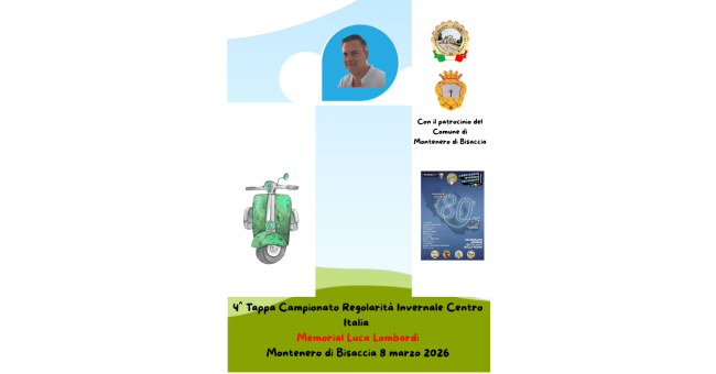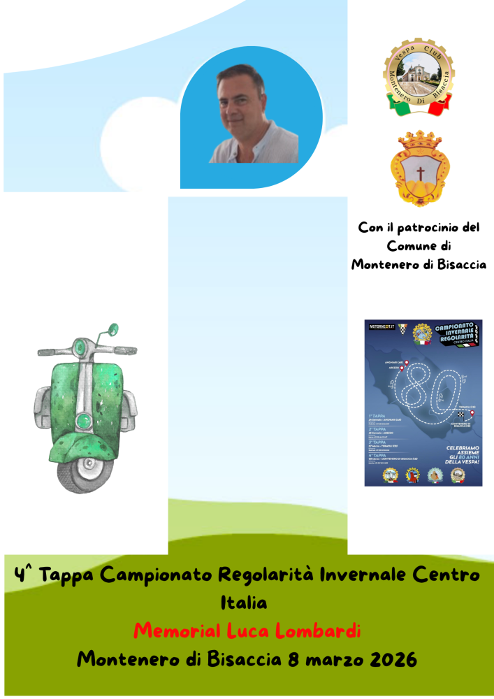 MARINA DI MONTENERO. Domenica 8 marzo il Vespa Club di Monenero di Bisaccia ospiterà la 4^ tappa del Campionato invernale di regolarità Centro Italia. Un evento dedicato alla memoria di Luca Lombardi, scomparso nel marzo 2025, e organizzato dal sodalizio montenerese in collaborazione con il Vespa Club d'italia. Parteciperanno circa 110 vespisti provenienti da Abruzzo, Molise, Marche, Toscana, Umbria, Lazio e Sardegna. L'inizio della manifestazione è previsto per le ore 9:00 presso il piazzale Guardia costiera alla Marina di Montenero di Bisaccia.