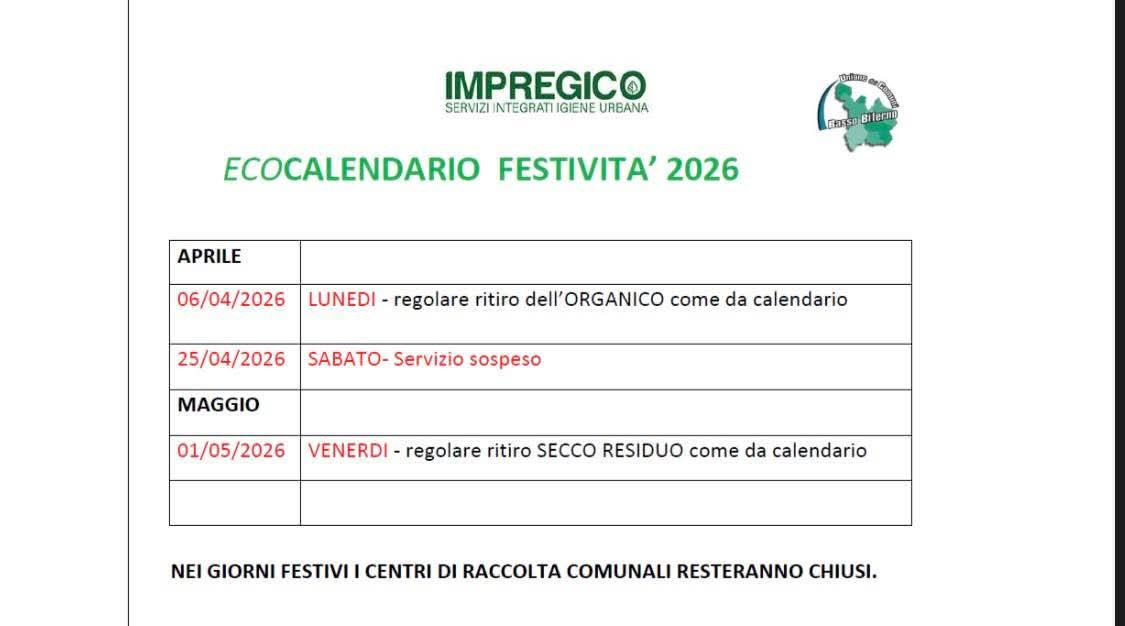 Si informa che domani, sabato 25 aprile, il servizio di raccolta differenziata dei rifiuti porta a porta sarà sospeso.