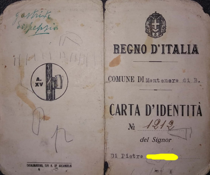 Analizzando il documento si nota in quarta di copertina la dicitura "A. XV", che significava quindicesimo anno dell'era fascista. Già , perché ogni dittatura che si rispetti ha il delirio di far ripartire il calendario della storia e quella di Mussolini non fece eccezione. Chiaramente l'Italia non era ancora una repubblica e per questo si legge "Regno d'Italia", ma c'è un altro fondamentale aspetto da analizzare, facendo attenzione all'anno di emissione del documento. Nell'aprile 1937 mancava appena un anno alle leggi razziali e difatti accanto alla dicitura "nazionalità " non era ancora battuta a macchina anche la scritta "razza ariana", come sarebbe diventato normale poco dopo. A Montenero per fortuna quelle leggi non ebbero nessun effetto pratico, date le minuscole dimensioni. Eppure il documento di una qualsiasi signora Di Pietro, probabilmente preoccupata di ben altro all'epoca, mostra come la storia sia a quei tempi di colpo mutata, e molto in peggio.