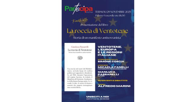 L'associazione politico culturale "Partecipa Molise" promuove sabato 29 novembre 2025 nel Palazzo Vescovile di Termoli, la presentazione del libro "La roccia di Ventotene: Storia di un manifesto antisovranista" (Einaudi, 2025) del Professore Gianluca Passarelli. L'incontro sarà un luogo di discussione e di riflessione, che comprenderà necessariamente l'attualità sull'incerta trattativa in corso per il futuro dell'Ucraina, ma anche sulle politiche di bilancio UE - dove occorre assicurare che la coesione mantenga un ruolo centrale nel QFP post-2027 - contro il rischio che venga sacrificata per finanziare le nuove spese su difesa e competitività . L'autore è uno dei politologi più noti nel panorama italiano: docente di Scienza Politica e Politica Comparata presso il Dipartimento di Scienze Politiche della Sapienza Università di Roma, collabora regolarmente con importanti testate giornalistiche come il «Corriere della Sera» e «Domani» ed è ospite frequente di approfondimenti televisivi e radiofonici. Tra le sue opere principali figurano saggi sulla presidenza della Repubblica e sul futuro dell'Unione Europea.