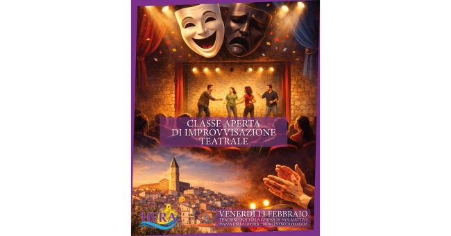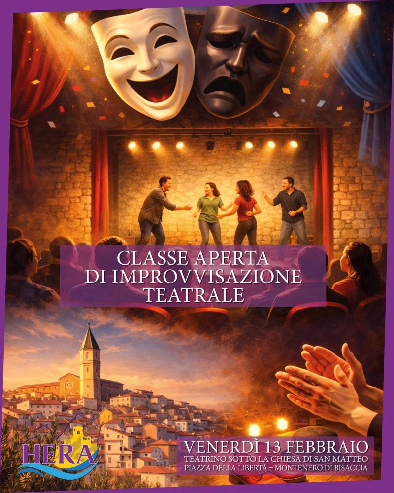 Questa sera alle ore 20:00 ci sarà uno spettacolo di improvvisazione teatrale, con alcuni attori della compagnia locale "Sipario Bisaccia" che hanno seguito un corso di oltre 3 mesi, condotto dall'insegnante Loredana D'Agruma, svolto presso il palazzo Caroselli, sede locale della Fondazione Hera.