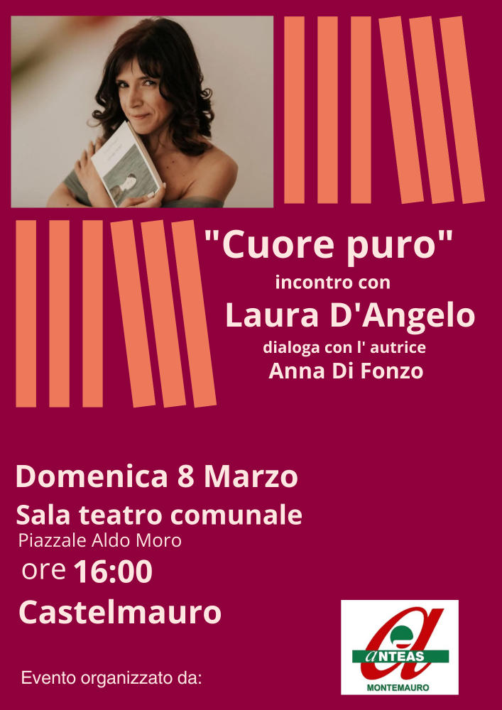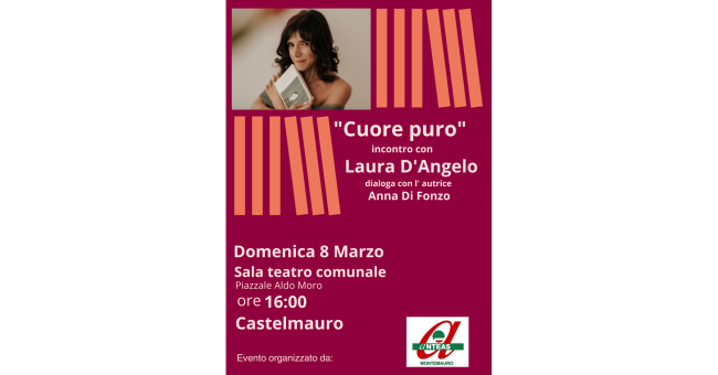 Laura D'Angelo, scrittrice, critico letterario, docente a contratto presso l'Unimol, molisana, è a Castelmauro domenica 8 marzo alle 16.00 nella sala del teatro comunale per la presentazione del suo libro "Cuore puro" (Interno Libri Edizioni) in dialogo con Anna di Fonzo, del Circolo neo illuminista "Donna Olimpia Frangipane".