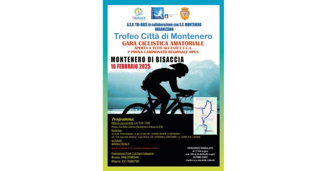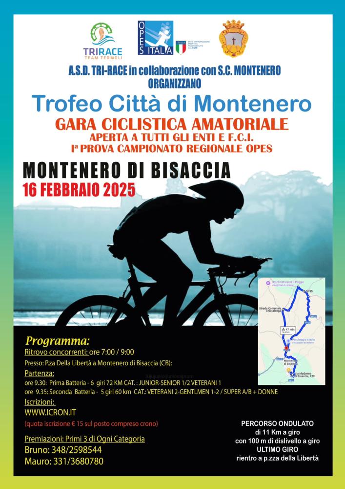 MONTENERO DI BISACCIA. Per la neonata Sc Montenero è il battesimo nell'organizzazione di una gara, ma a dare manforte sarà una società ben rodata come la Tri-Race di Termoli, guidata da un veterano dello sport molisano e montenerese di origine come Bruno Irace. È in programma per domenica 16 febbraio e si intitola Trofeo Città di Montenero la gara ciclistica riservata alla categoria Amatori, valida come prima prova di campionato regionale Opes.