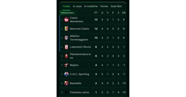 Il Montenero consolida la leadership del campionato con uno score di quattro vittorie ed un pareggio con 16 reti in cinque giornate.
