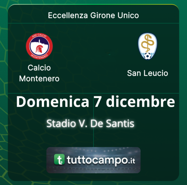 Domenica 7 dicembre alle ore 15:00, per la quattordicesima giornata del campionato di eccellenza molisano, il Montenero ospiterà al De Santis l'Isernia San Leucio, provando a riscattare la prestazione sottotono della gara ad Agnone nell'ultimo turno.