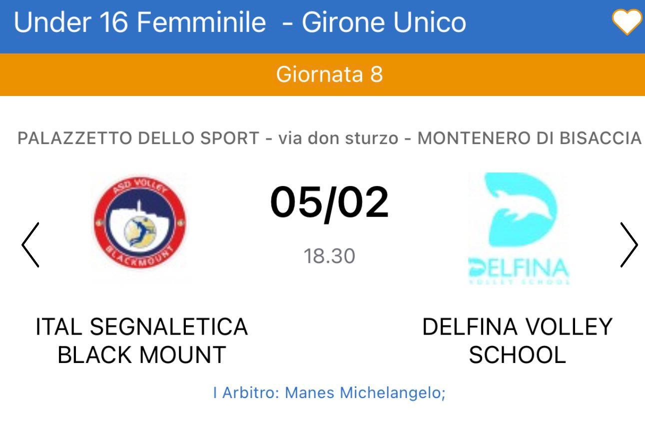 Ottava giornata di campionato per l’Under 16 femminile e i riflettori sono tutti puntati sul Palazzetto dello Sport di Montenero. Giovedì 5 febbraio, con fischio d'inizio alle ore 18:30, le ragazze della Volley Blackmount scenderanno in campo per affrontare la corazzata Delfina Volley School in un match che promette scintille.